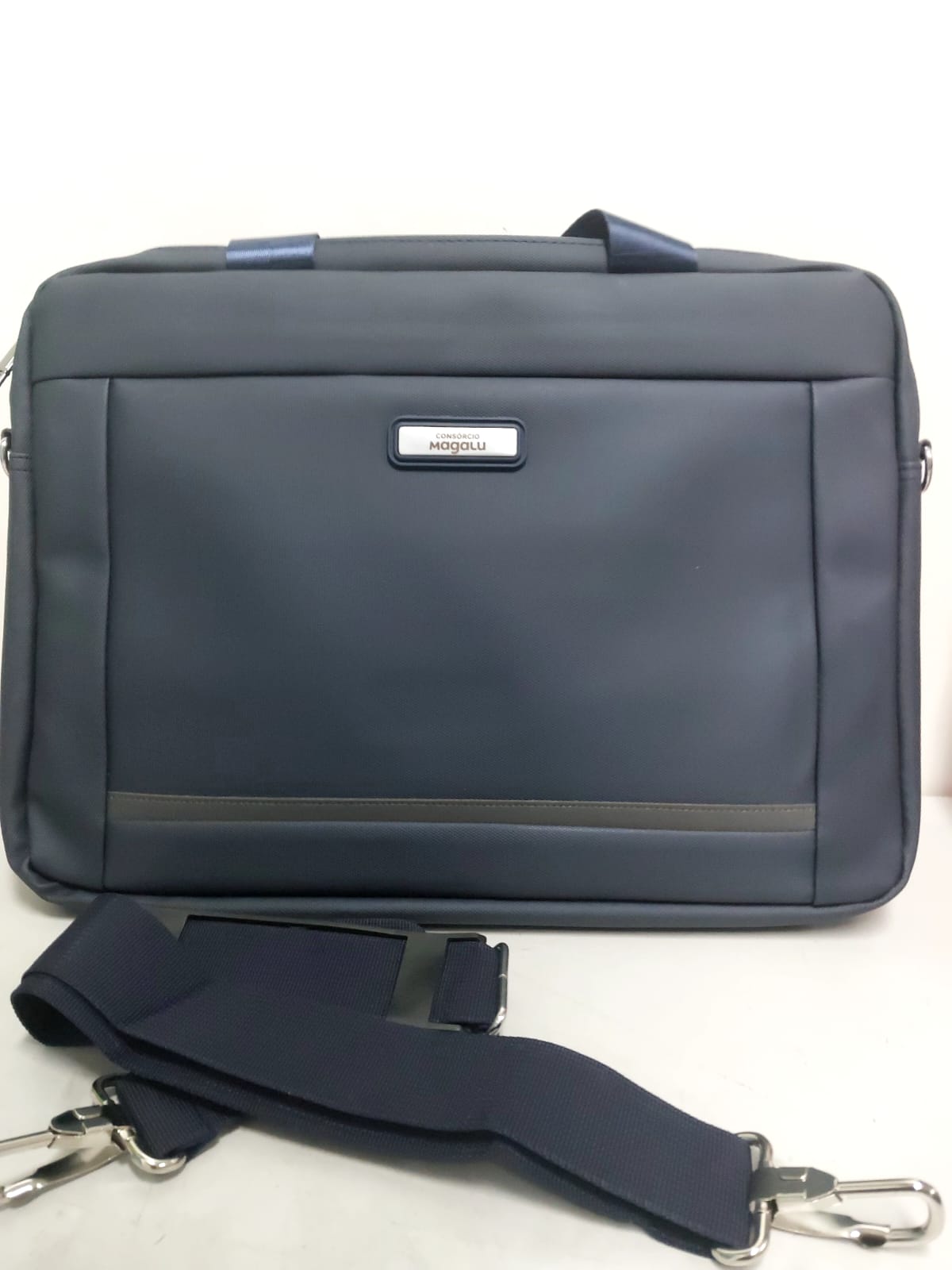 Possui dois compartimentos: o principal, com revestimento acolchoado, quatro bolsos abertos de tamanhos diferentes e duas divisórias para canetas; e o frontal, com plaquinha metálica fixa na parte externa, personalizada CONSÓRCIO MAGALU